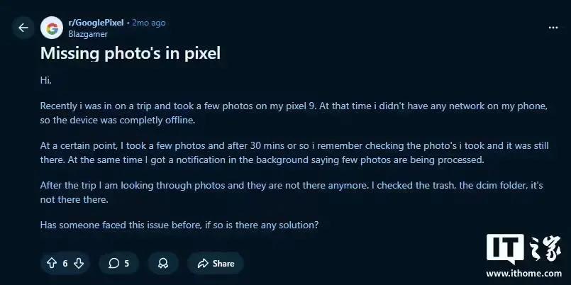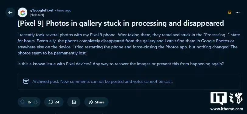 12 月 24 日消息,据 AndroidAuthority 报道,部分谷歌 Pixel 系列手机出现异常故障,导致用户照片丢失。近日,有多位 Reddit 论坛用户发帖反映,用 Pixel 手机拍摄的照片“不翼而飞”,既未出现在本地存储中,也没有备份到谷歌相册(Google Photos)。