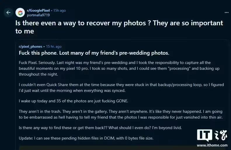 此外,Reddit 上还有一则发布者账号已注销的旧帖,内容也与该问题高度相似。有评论者表示,自己的 Pixel 10 Pro、Pixel 10、Pixel 9a 和 Pixel 8a 机型均出现过相同故障。从用户反馈来看,许多受影响者都是在短时间内拍摄大量照片后遭遇此问题;还有多名用户称,在手机的 DCIM 文件夹中发现了一批异常的 JPG 文件,这些文件名称中均包含“pending”(待处理)字样,且文件大小均为零字节。