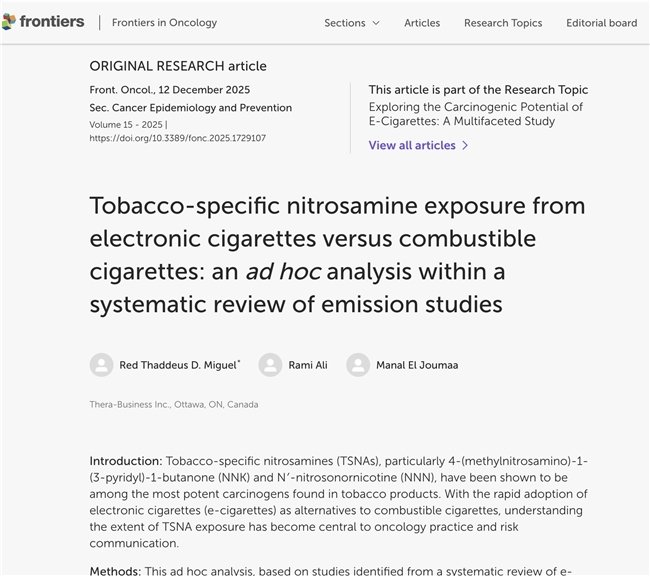 12月22日,《肿瘤学前沿》(Frontiers in Oncology)在线发布的一份重磅综述表示,与传统卷烟相比,电子烟释放的致癌物NNK与NNN平均降幅超过99%,浓度低至空气平均水平。这表明烟民完全改用合规电子烟,可以显著减少烟草特有亚硝胺(TSNAs)的摄入,进而减少肺癌、食管鳞癌等疾病风险,对肿瘤预防具有积极意义。