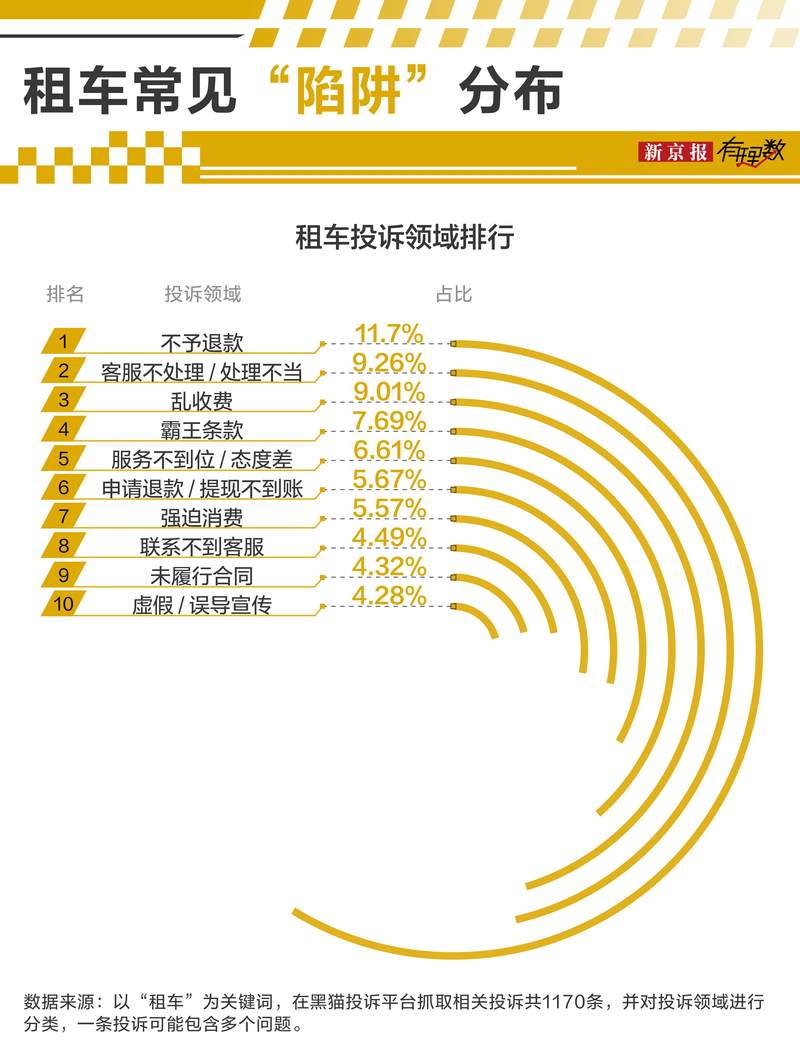 通过梳理近三个月关于“租车”的投诉,发现不只保险,其涉及的问题五花八门,从隐性收费到车辆质量,从售后处理到服务态度恶劣,种种问题层出不穷,其中最突出的就是“退费困难”。