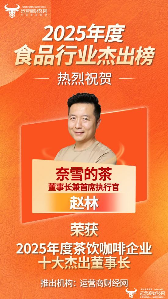 近日,由运营商财经网独家打造的“2025年度茶饮咖啡十大杰出董事长”榜单正式揭晓,奈雪的茶董事长兼首席执行官赵林成功入选!