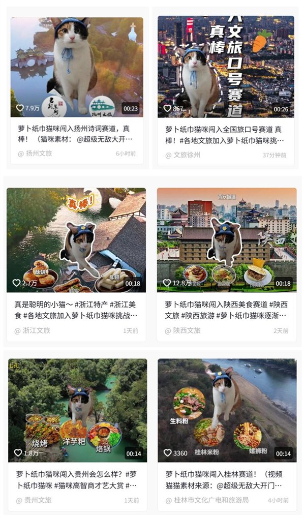 不仅如此,这只猫咪还闯入了文旅赛道。扬州文旅、徐州文旅、贵州文旅、桂林文旅、浙江文旅、陕西文旅等多个文旅账号纷纷发布“萝卜纸巾猫”的视频。
