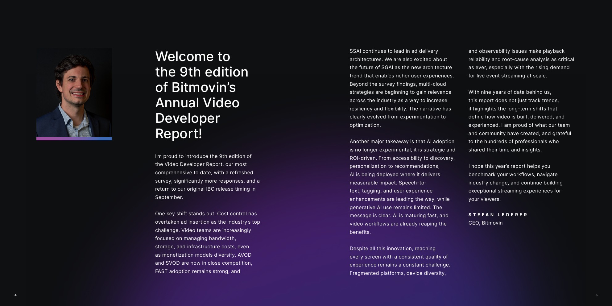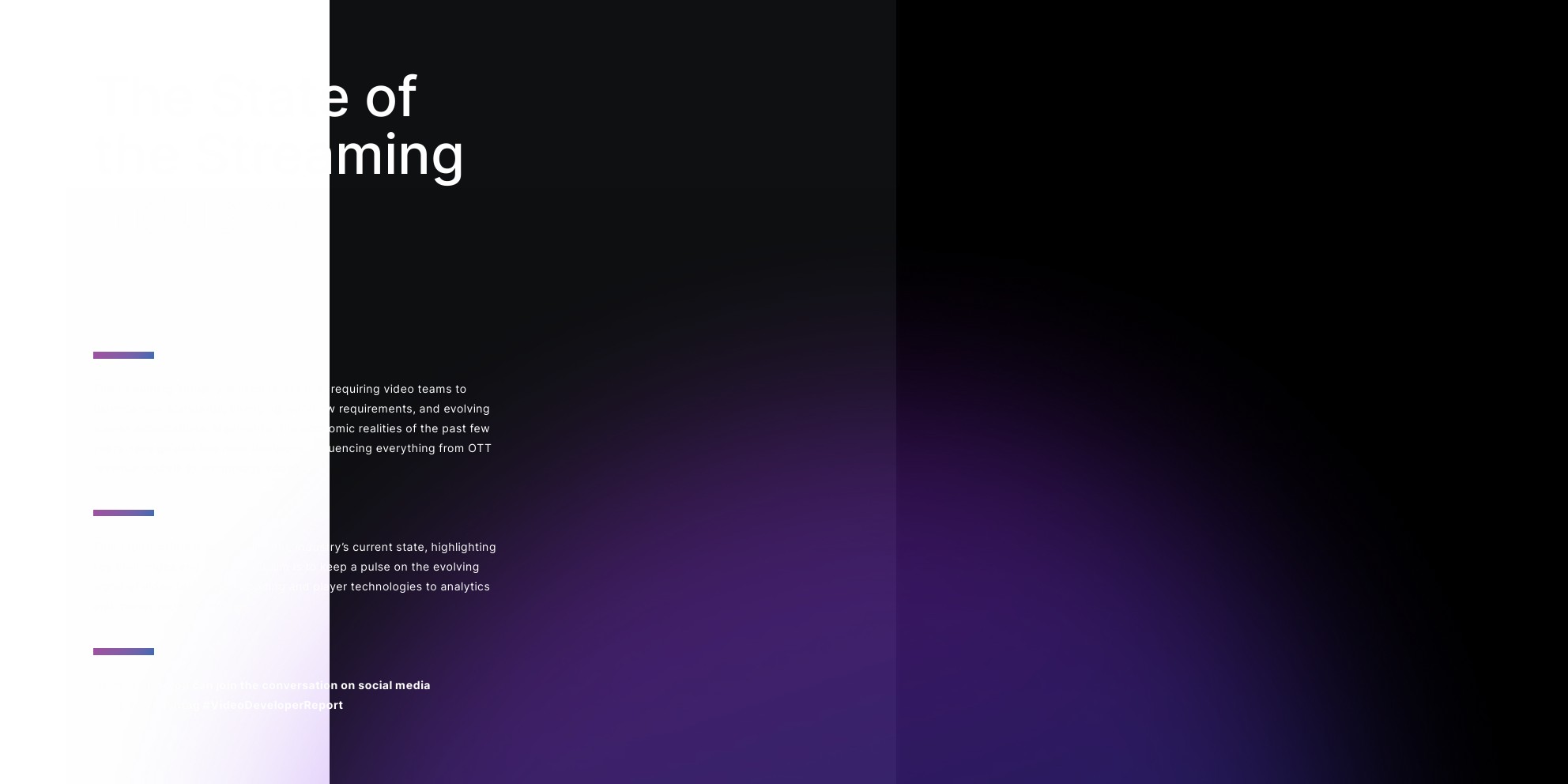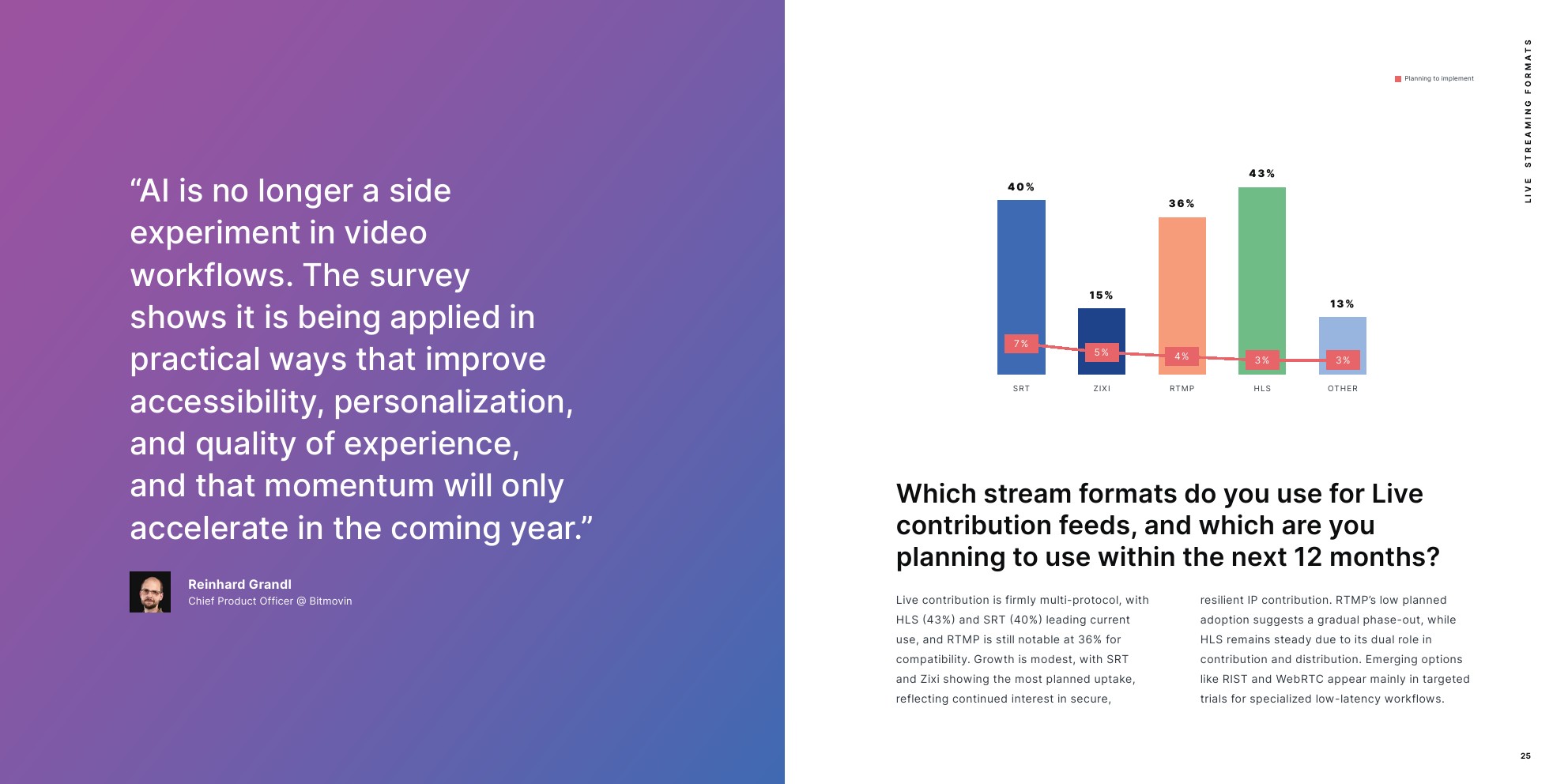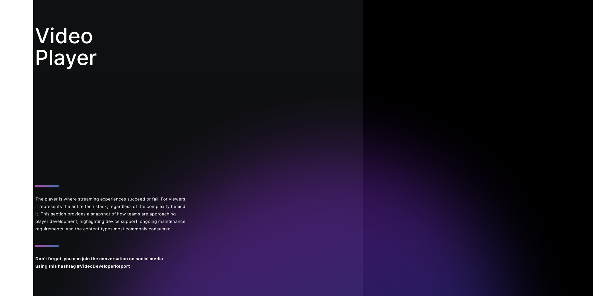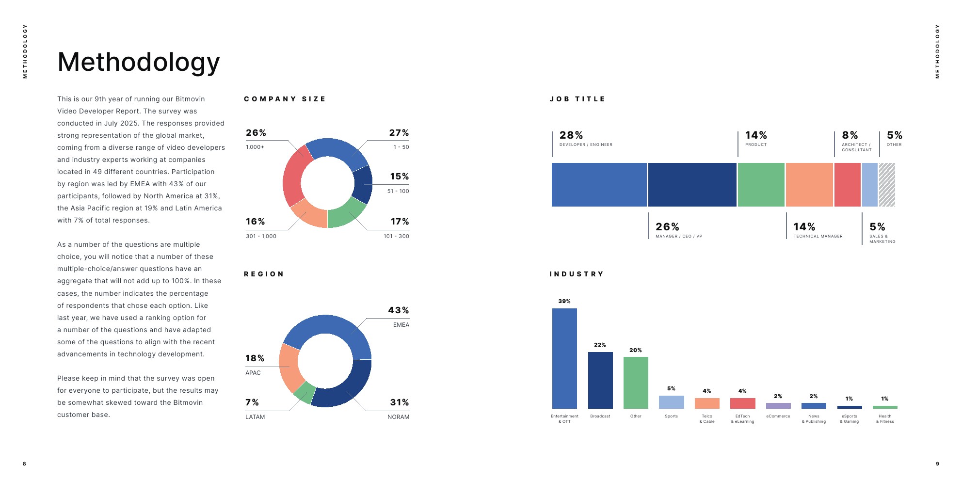 Bitmovin发布了“第九个年度视频开发者报告”。该调查于2025年7月进行。回复提供了全球市场的强代表性,来自49个不同国家公司的多元化视频开发者和行业专家。按地区参与情况以EMEA为首,占参与者的43%;其次是北美,占31%;亚太地区占19%;拉丁美洲占7%。