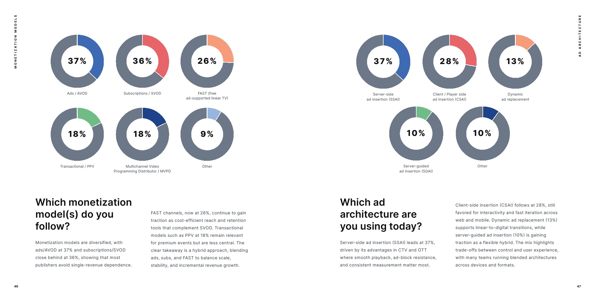 关于货币化模型,AVOD和SVOD近乎持平,FAST采用保持强劲,SSAI是领先的广告架构。