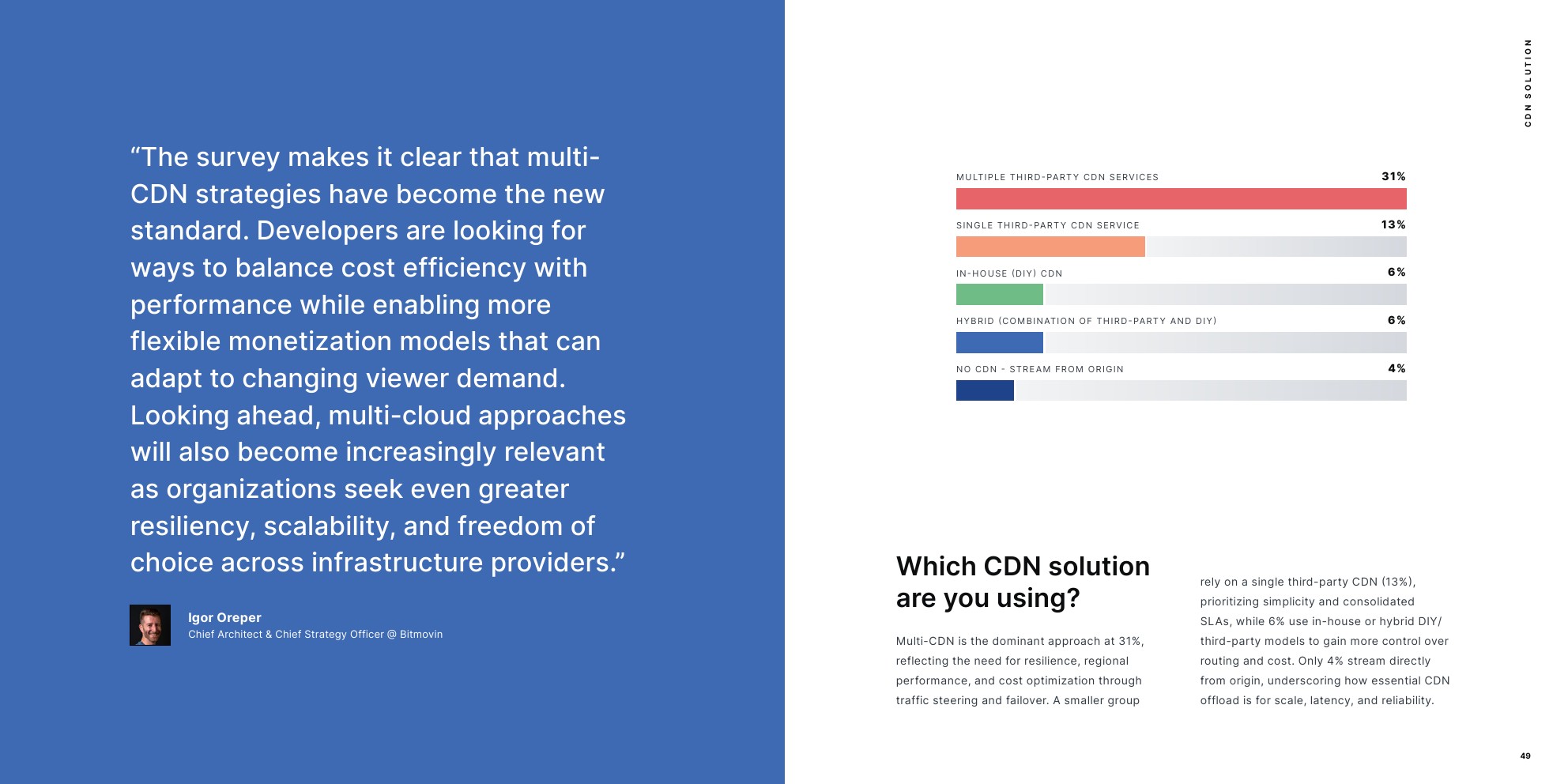 弹性仍是最高优先事项,多第三方CDN是最常见的交付设置,以保障性能和可用性。