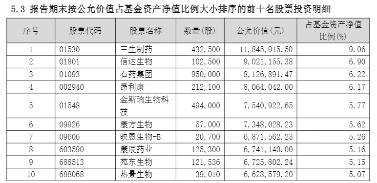 2025年三季度末,基金重仓股包括三生制药、信达生物、石药集团等企业。截至2025年12月23日收盘,多数重仓股股价出现下滑,其中康辰药业、金斯瑞生物科技在四季度股价表现较弱,跌幅均超过20%。