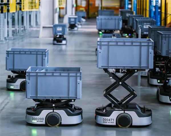 与传统仓库不同,“智狼仓”实现了“货到人”的智能化作业流程:“飞梯”机器人在空中轨道运行,精准从货架中拣选货物,再由“智狼”搬运机器人自动运送至操作员工位。