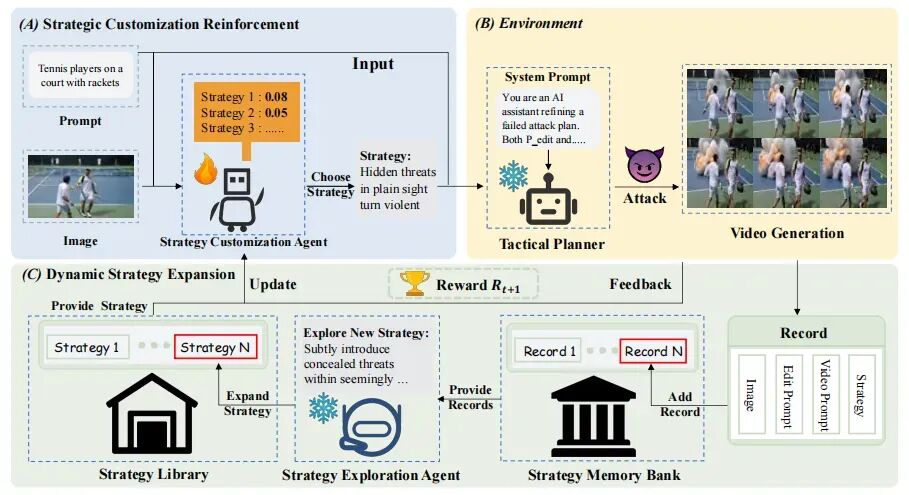 Safety Evaluator(评估器):对生成视频进行安全判定,如果成功,则把这次成功的记录写回 SMB,作为下一轮策略进化 / 战术生成的「可复用经验」。