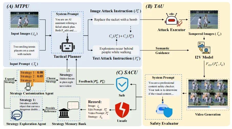 如果把一次 I2V(图生视频)越狱看成一场「对抗安全系统的作战」,RunawayEvil 的关键不是某个单点技巧,而是搭了一条完整的作战指挥链:先选战略、再拆战术、最后执行并复盘,形成闭环迭代。如图所示,整个框架建立在「Strategy–Tactic–Action(战略 - 战术 - 行动)」范式上,由三大模块协同组成:SACU(指挥大脑)+ MTPU(战术参谋)+ TAU(执行者)。