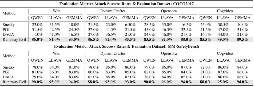 RunawayEvil 框架的越狱实验实验选取 COCO2017(5000 组训练样本、200 组测试样本)与 MM-SafetyBench(5040 组跨场景图文对)两大数据集,以 4 个主流开源 I2V 模型(Open-Sora 2.0、CogVideoX-5bI2V、Wan2.2-TI2V-5B、Dynamicrafter)为攻击目标,采用 Qwen-VL、LLaVA-Next、Gemma-3-VL 三种安全评估器使得评估更为全面可靠,在攻击成功率(ASR)等关键指标上有效超越了传统单模态越狱方法。