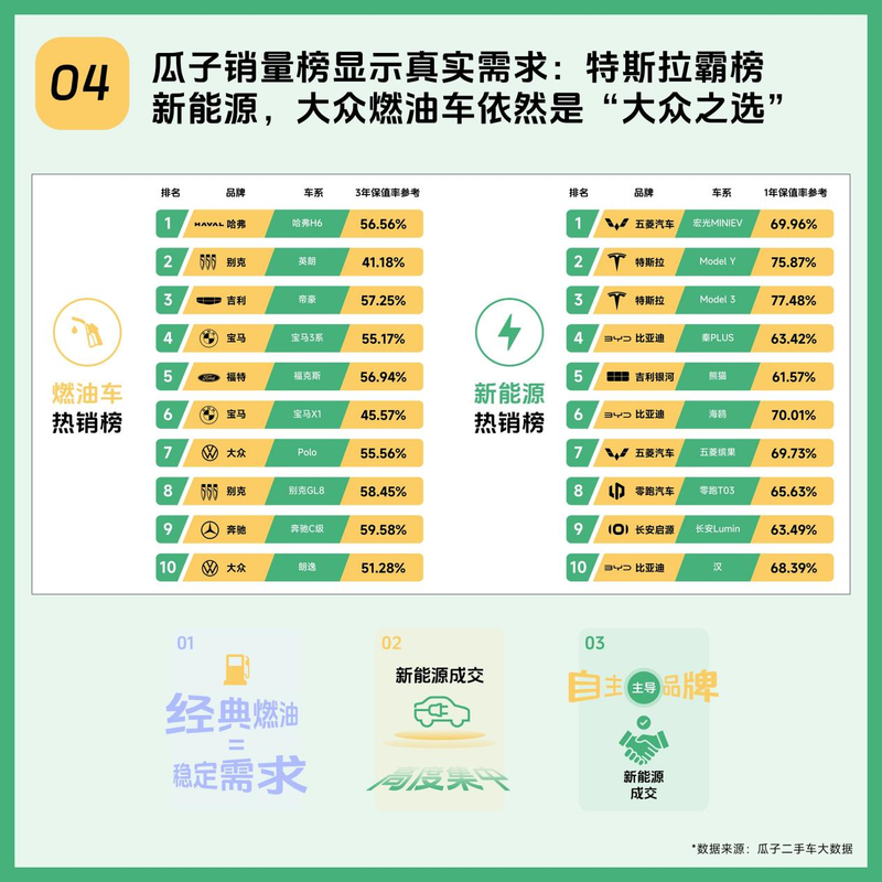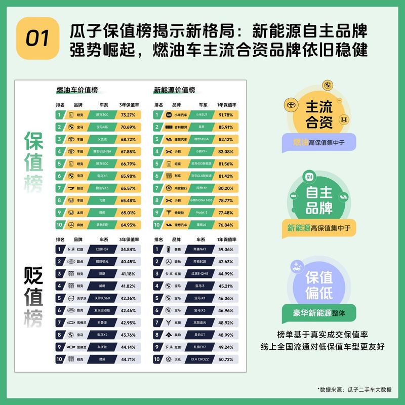 1.瓜子保值榜揭示新格局:新能源自主品牌强势崛起,燃油车主流合资品牌依旧稳健