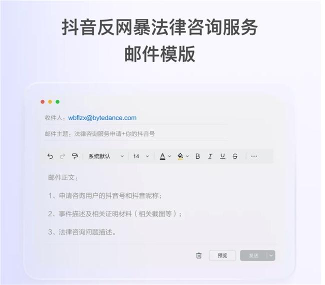 如果用户觉得自己遭遇了不友好的言论,可第一时间开启“一键防网暴”功能,禁止他人对自己评论、私信等,也可批量举报不良私信。用户若在维权过程中遇到需要咨询的法律问题,还可通过法律咨询邮箱wbflzx@bytedance.com进行咨询。未来,抖音将持续强化网暴治理,为用户提供反网暴咨询服务,帮助用户维护合法权益。