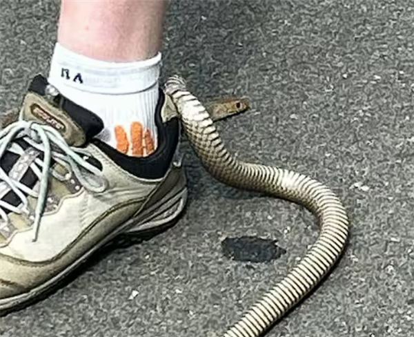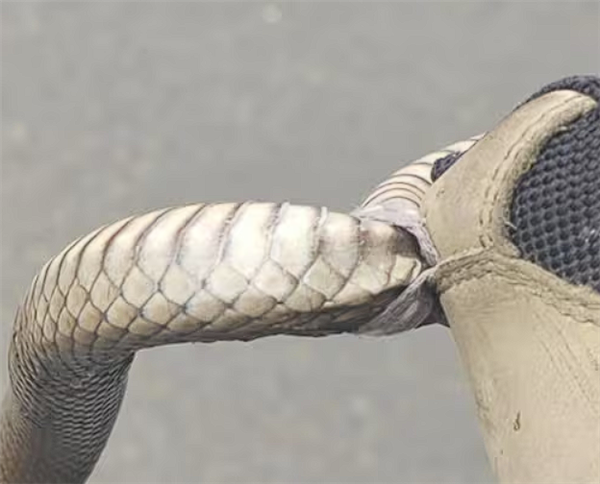女子发现蛇后异常冷静,立即静止不动,避免激怒毒蛇,然而,被惊扰的蛇还是顺着她的脚踝钻进了运动鞋后跟环,被死死卡住。