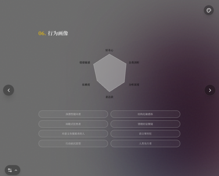 好奇心、依赖度、分析深度、 表达欲、情绪敏感度、 自我剖析频率