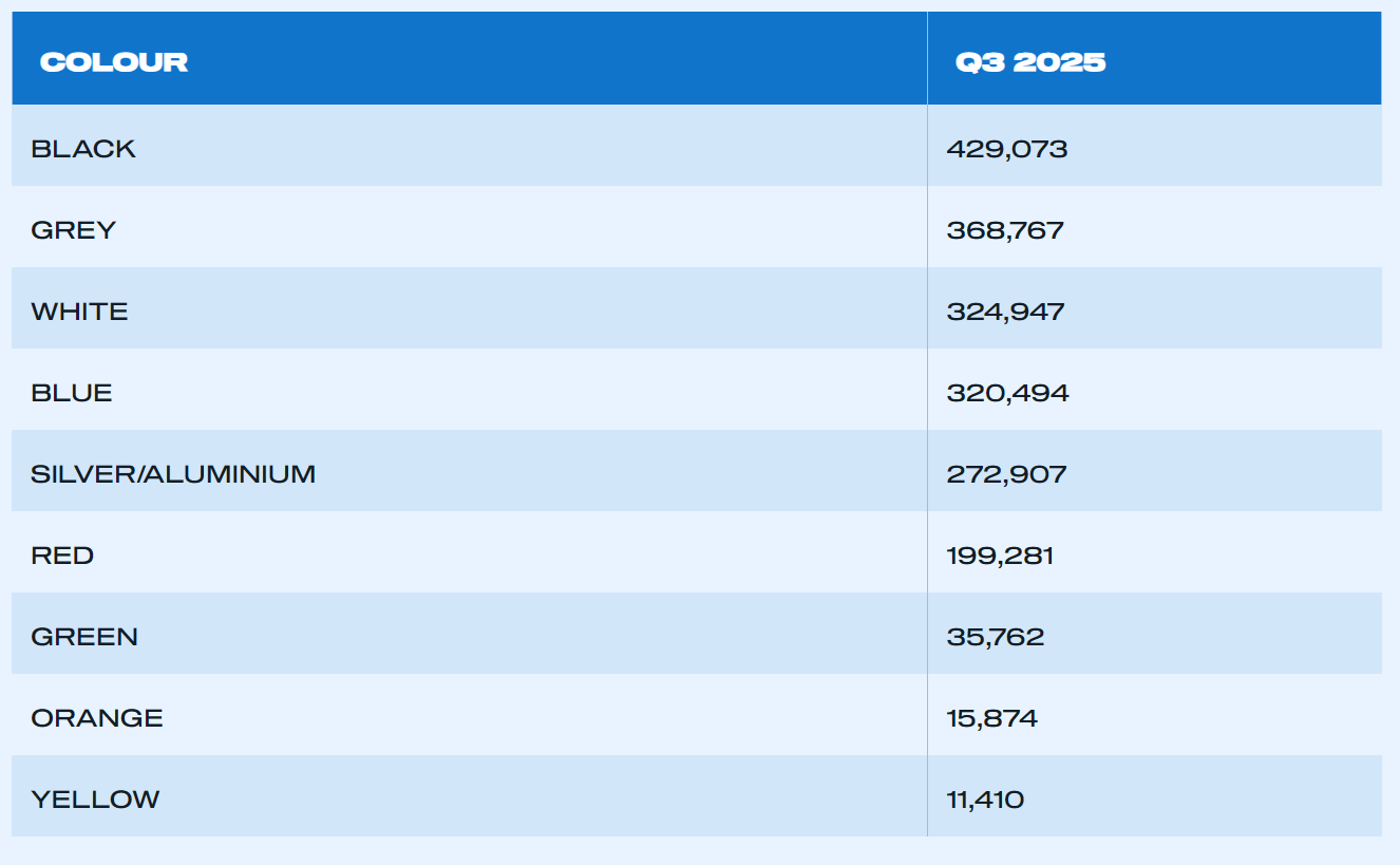 黑色与灰色仍是二手车最畅销颜色,分别增长3.1%和6.3%,白色(增长6.3%)超越蓝色跻身前三。奶油色涨幅最高达10.1%,但交易基数较小(1,379笔)。绿色以9.0%的增幅紧随其后(35,762笔)。尽管增长3.2%,绛红色车辆仅1,250笔交易,受欢迎度最低。粉色车辆跌幅最大(-7.0%,达到1,314辆)。