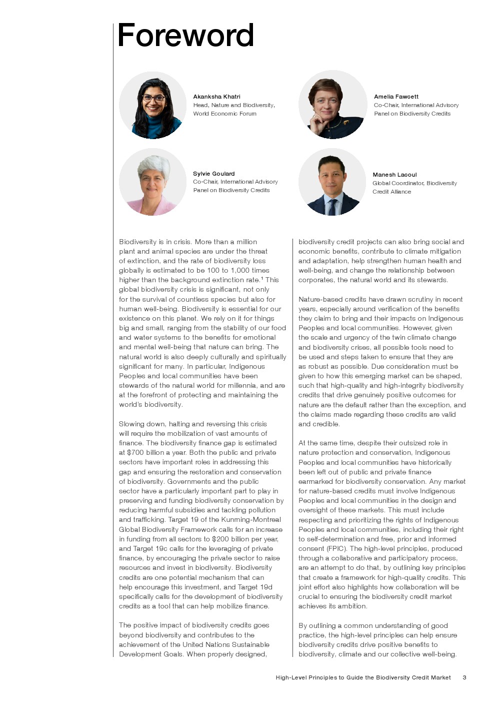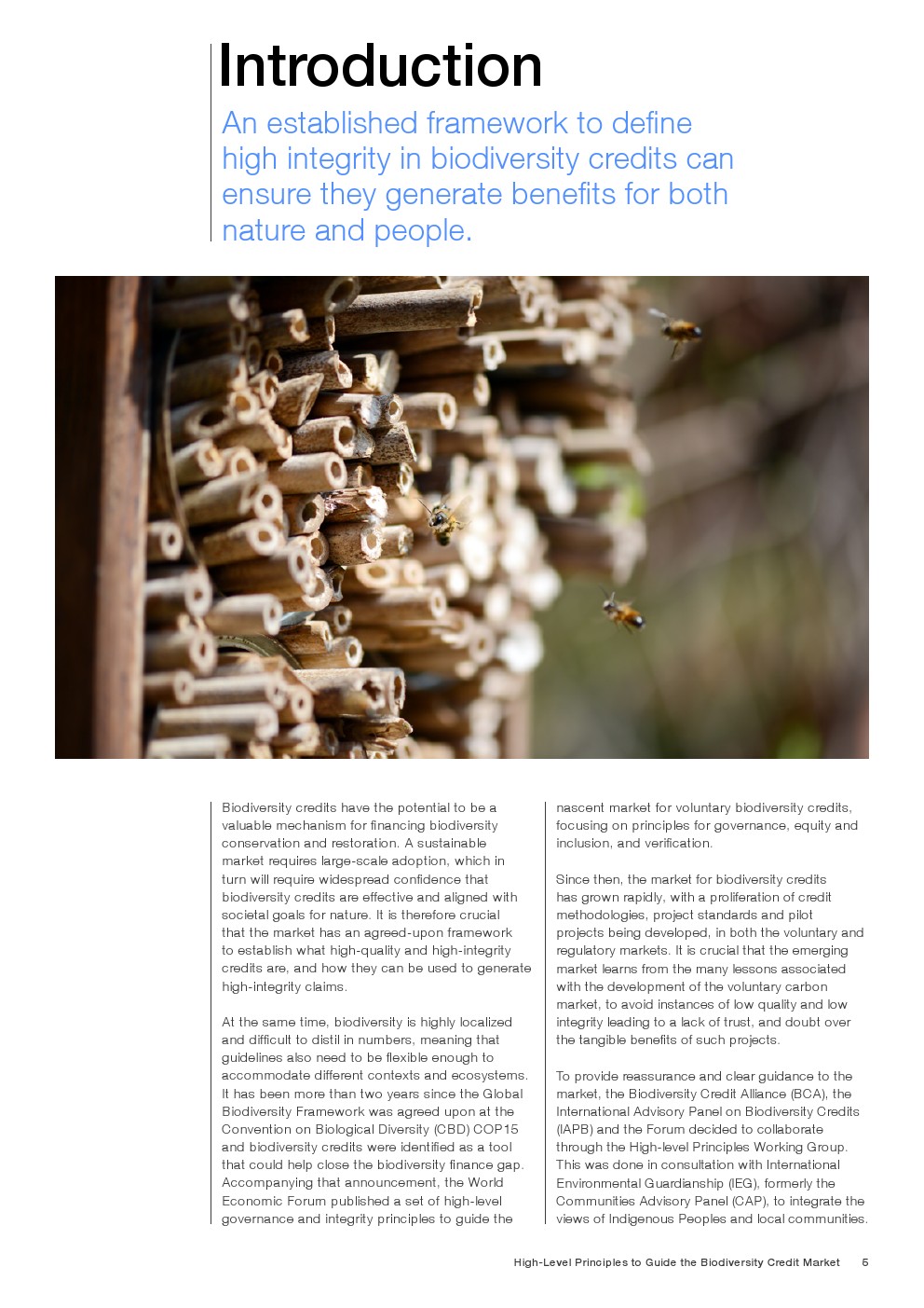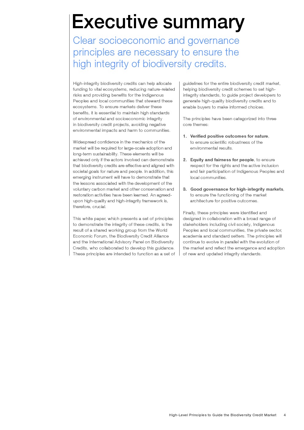 本白皮书提出了一套用于证明此类信用完整性的原则,是世界经济论坛、生物多样性信用联盟和国际生物多样性信用咨询委员会共同工作组合作的成果。这些原则旨在为整个生物多样性信用市场提供指导,帮助生物多样性信用计划制定高完整性标准,指导项目开发者生成高质量的生物多样性信用,并使购买者能够做出明智的选择。