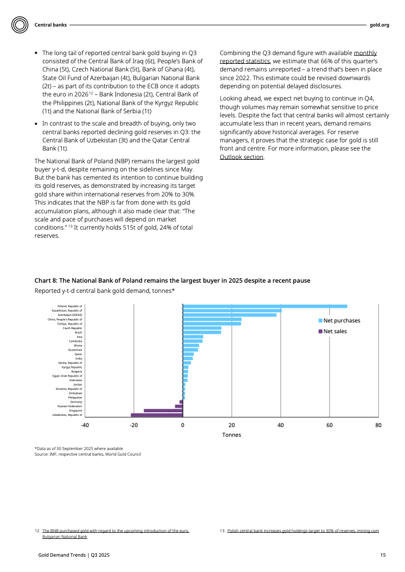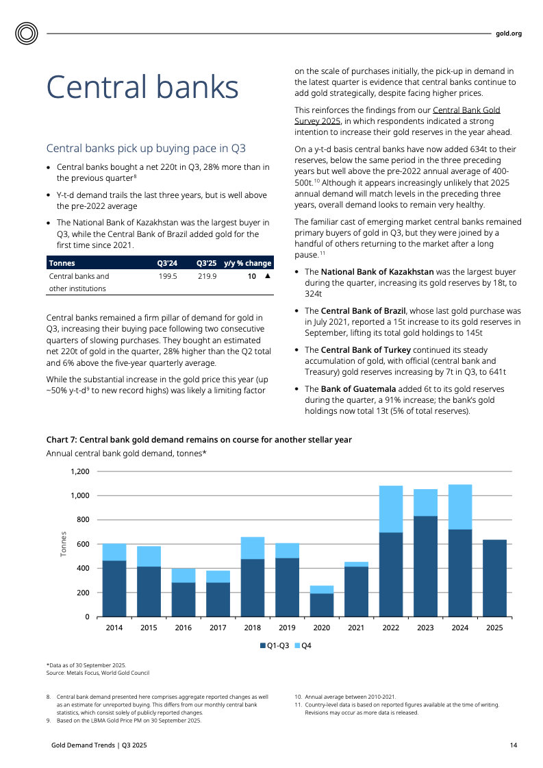 央行需求持续稳健。第三季度各国央行净购金220吨,哈萨克斯坦(+18吨)、巴西(+15吨)与土耳其、波兰等新兴经济体引领增持潮。年内累计央行购金634吨,虽低于去年同期724吨,但仍远高于2010-2021年间400-500吨的平均水平。超过三分之二的新增购金未公开报告,反映出全球央行“去美元化”和储备多元化趋势仍在深化。多国央行调查显示,近六成受访者计划在未来一年增加黄金储备。