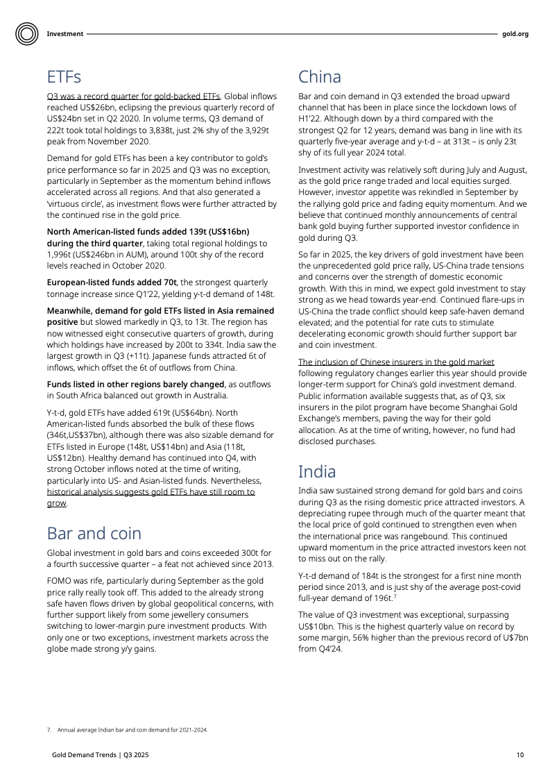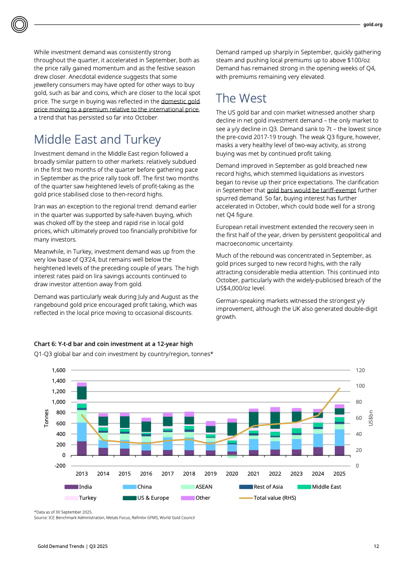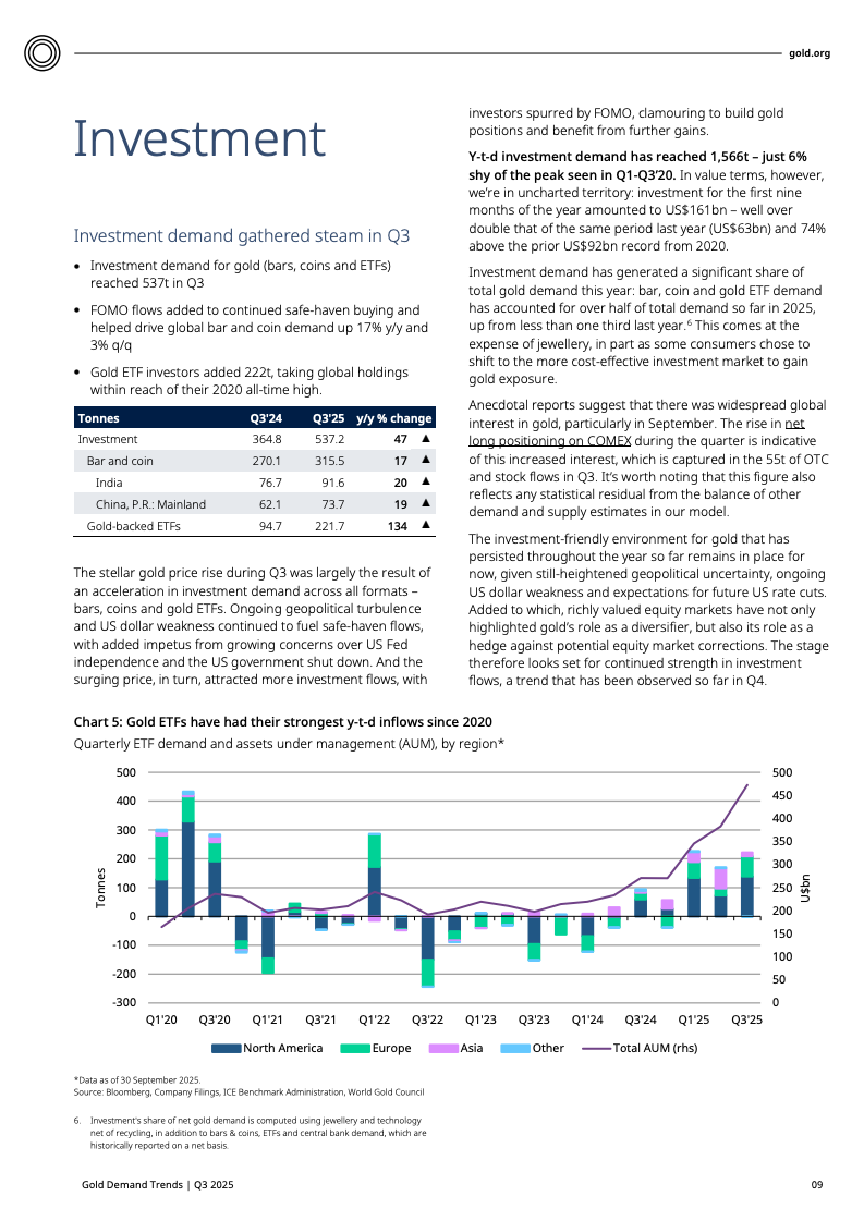 投资成为金市的绝对引擎。2025年前三季度,全球投资需求达1566吨,仅比2020年高点低6%,而以美元计的投资额则创1610亿美元新高,同比翻倍。黄金ETF资产管理规模(AUM)逼近2020年峰值,北美与欧洲资金贡献了近八成净流入。地缘政治紧张、美元走弱、美联储政策转向与通胀阴影共同塑造了这一波“避险+FOMO”行情。中国与印度的金币条需求分别增长19%与20%,印度季度投资额超过100亿美元创纪录。值得注意的是,传统“珠宝消费”部分资金已转向更具投资属性的产品。