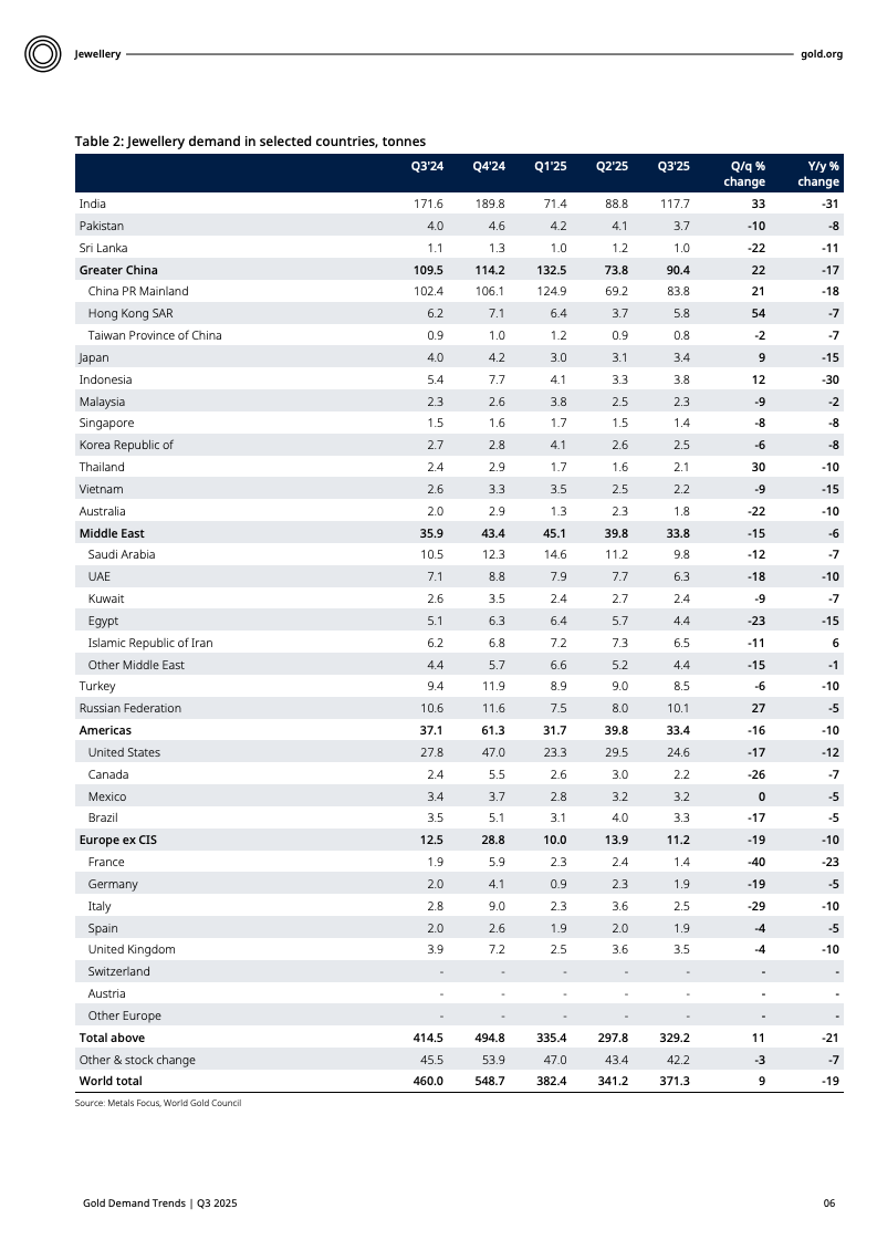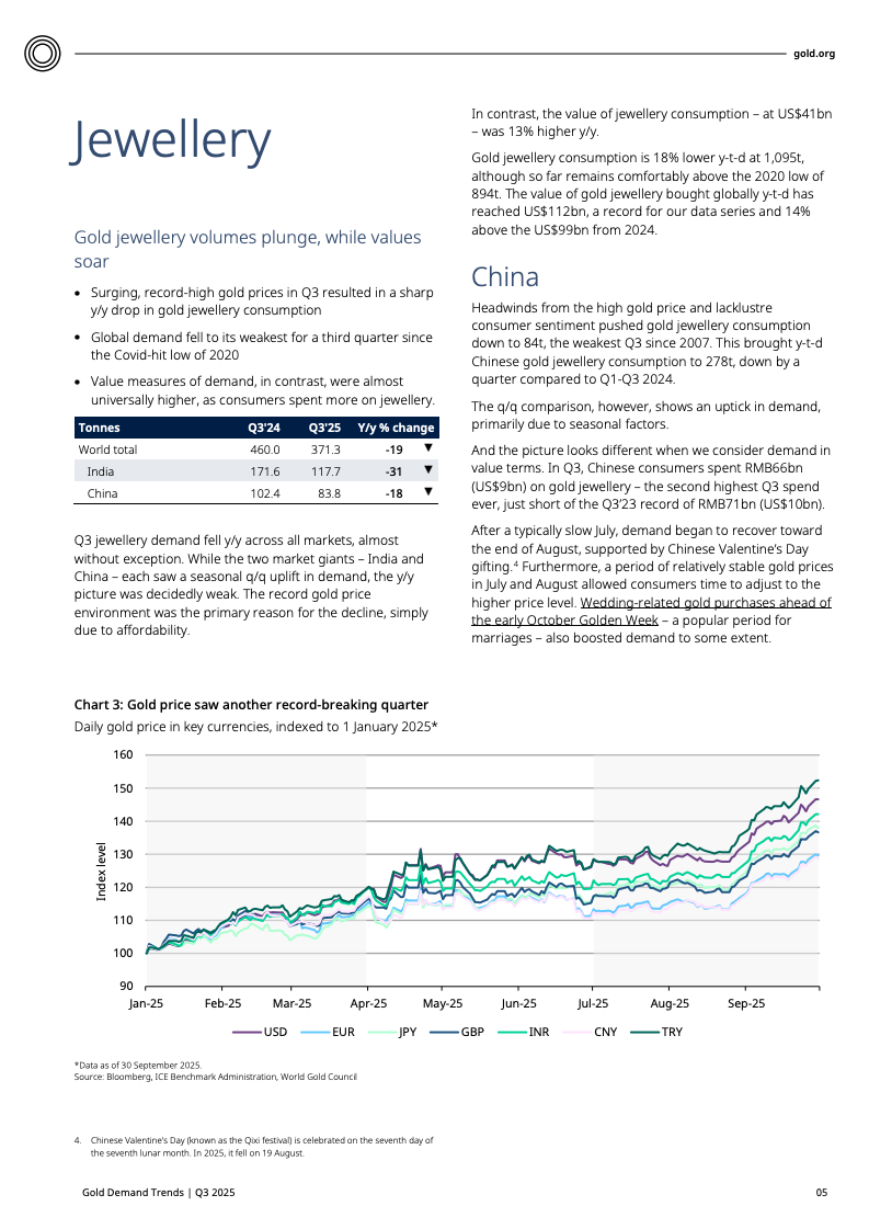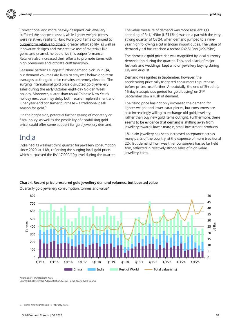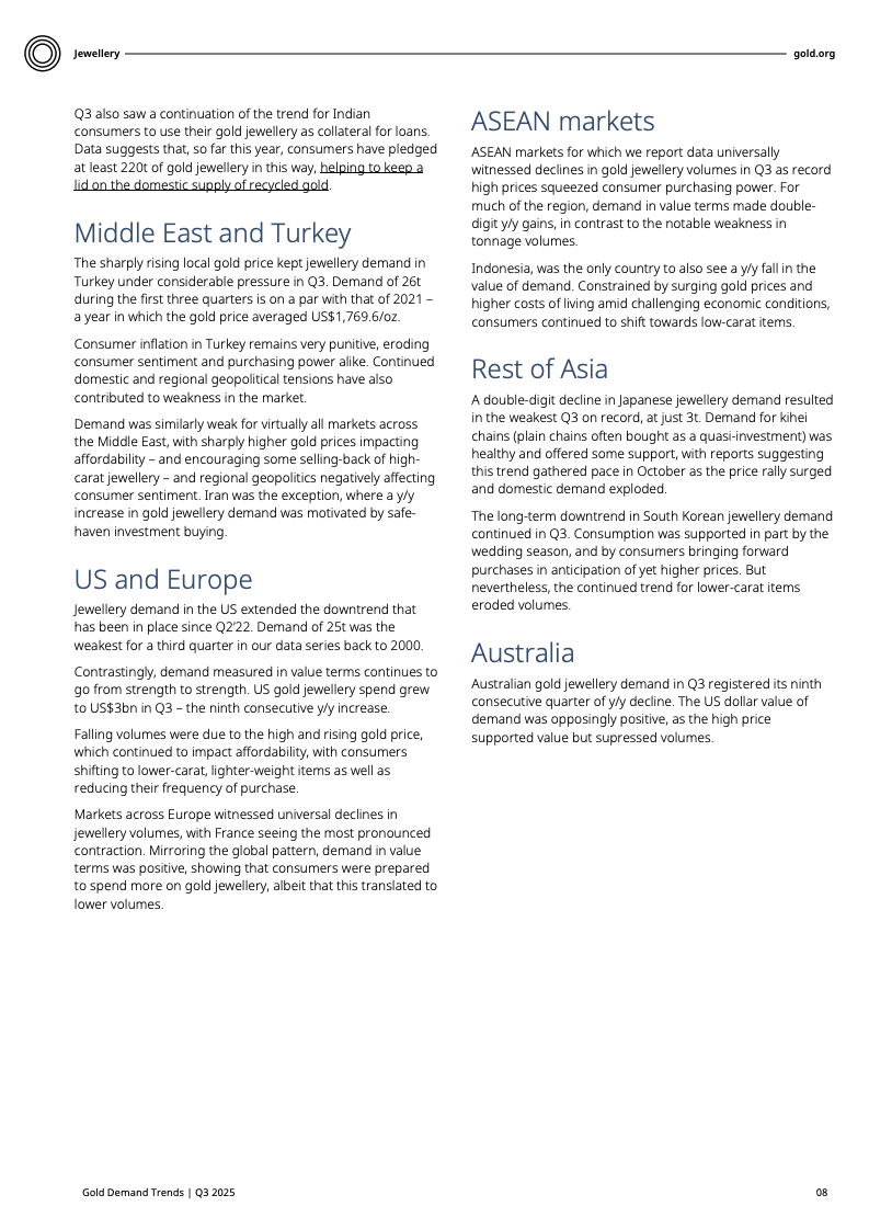 珠宝消费则承受高价压力,全球黄金首饰消费同比锐减19%至371吨,创疫情以来最低季度。中国消费降至84吨,为2007年以来第三季度新低;印度同样创下自2020年以来最弱季度,仅117吨。尽管如此,珠宝消费总价值仍同比上涨13%,达410亿美元,显示出高端产品和轻量化设计支撑了高价时代的消费结构转型。美国和欧洲市场延续量跌价升的趋势,消费者虽购买更少黄金,但愿意为品质与设计支付更高溢价。