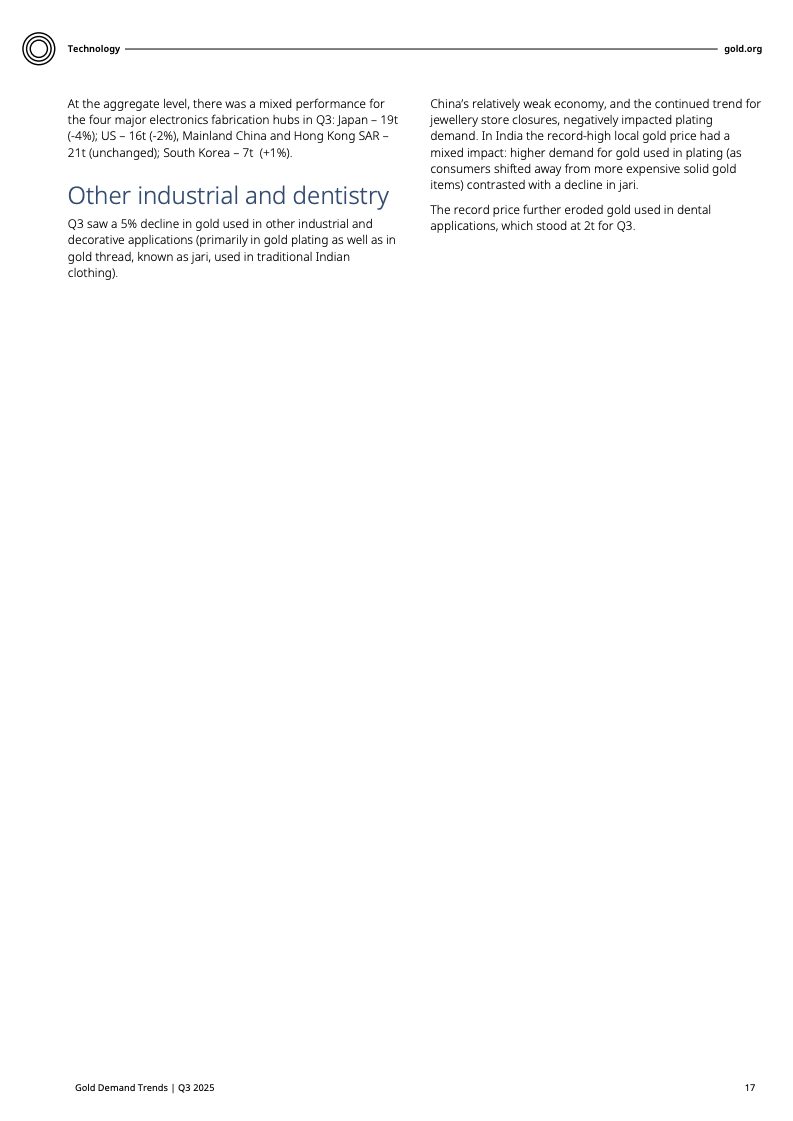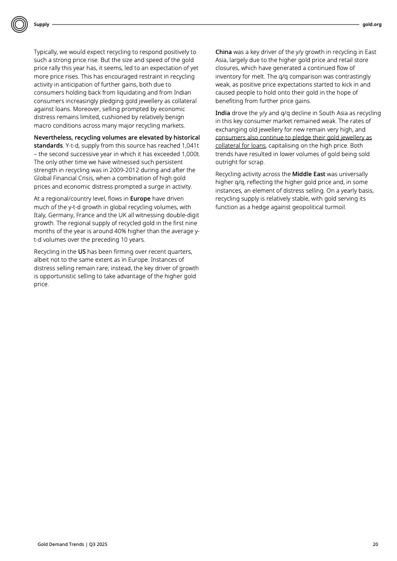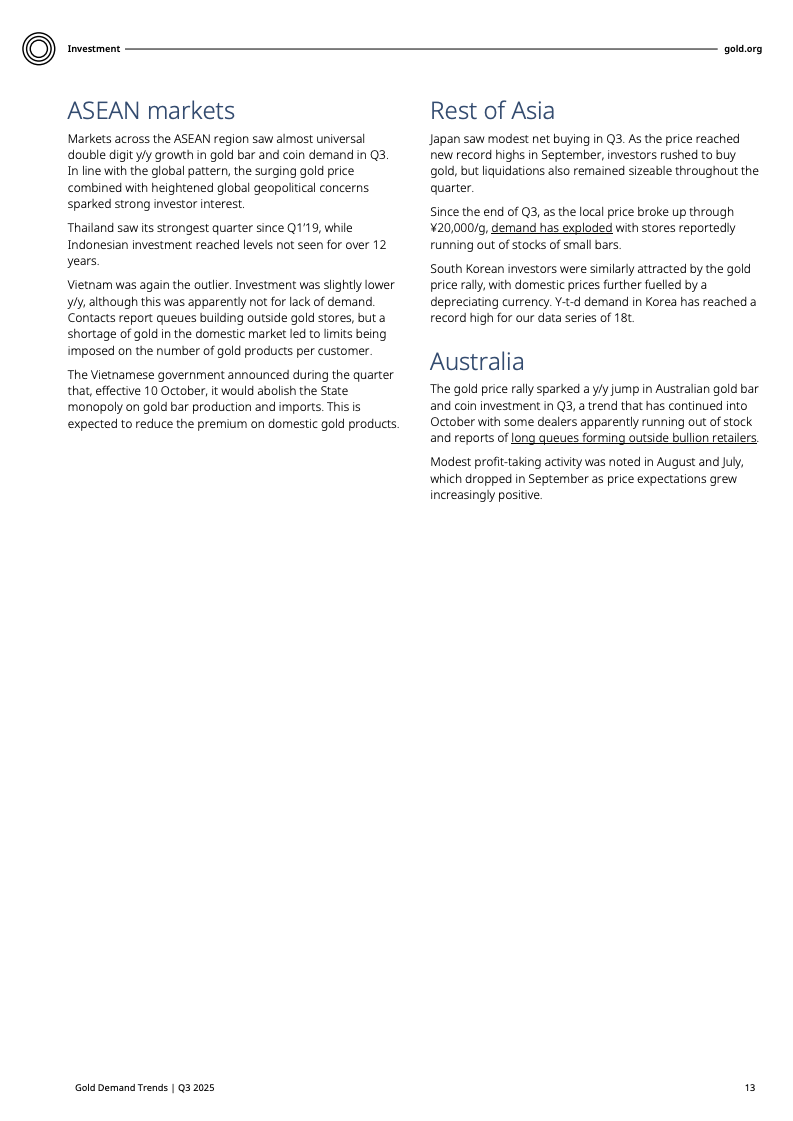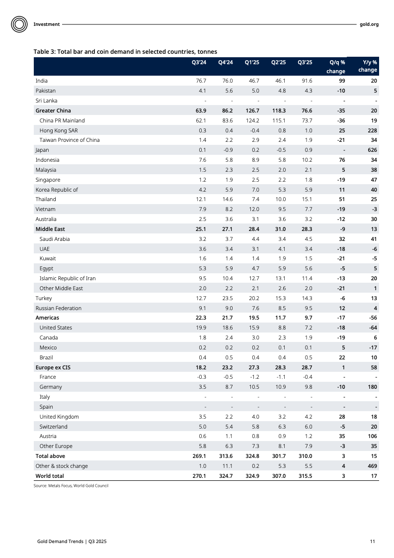 珠宝消费则承受高价压力,全球黄金首饰消费同比锐减19%至371吨,创疫情以来最低季度。中国消费降至84吨,为2007年以来第三季度新低;印度同样创下自2020年以来最弱季度,仅117吨。尽管如此,珠宝消费总价值仍同比上涨13%,达410亿美元,显示出高端产品和轻量化设计支撑了高价时代的消费结构转型。美国和欧洲市场延续量跌价升的趋势,消费者虽购买更少黄金,但愿意为品质与设计支付更高溢价。