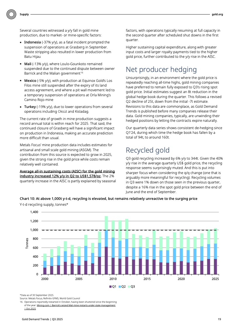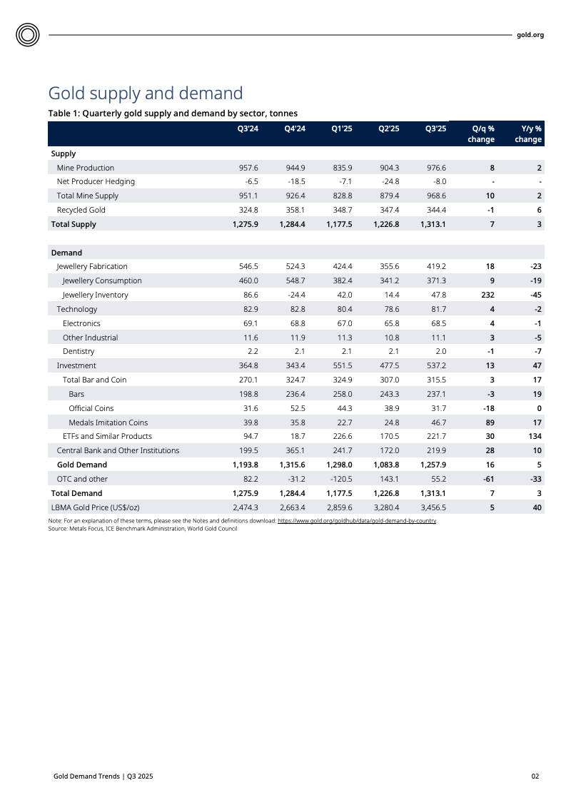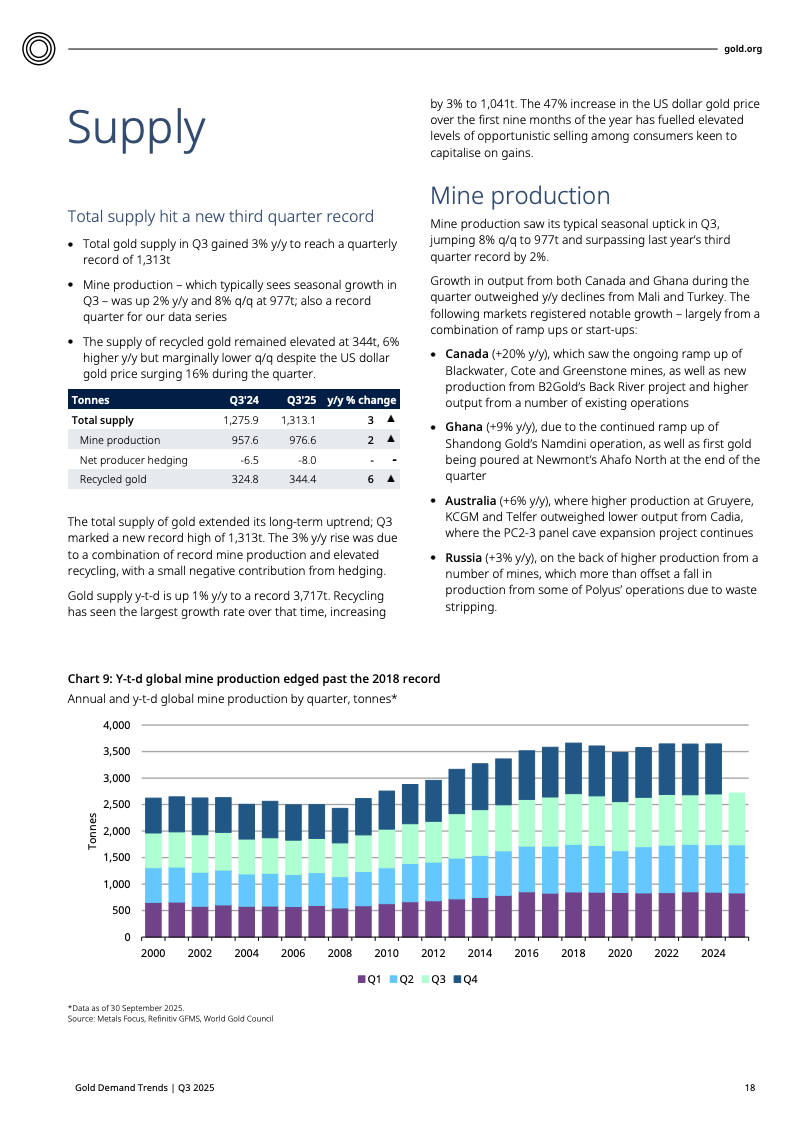 供给侧同样维持高位。全球矿产金产量977吨,同比增长2%;加纳、加拿大和澳大利亚是增长主力,而印尼与马里受矿区停产影响产量下滑。回收金供应稳定在344吨,虽同比升6%,但在高价环境下反应依旧温和,主要因消费者普遍预期金价将进一步上行。