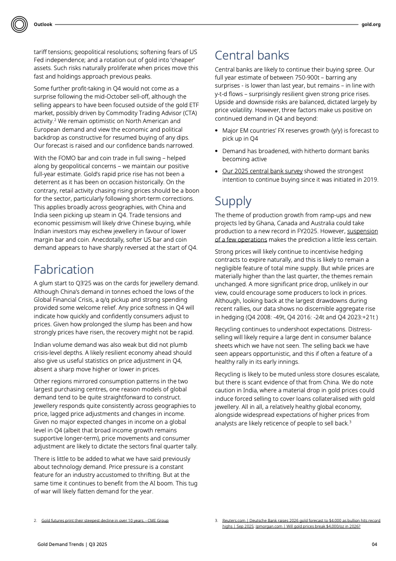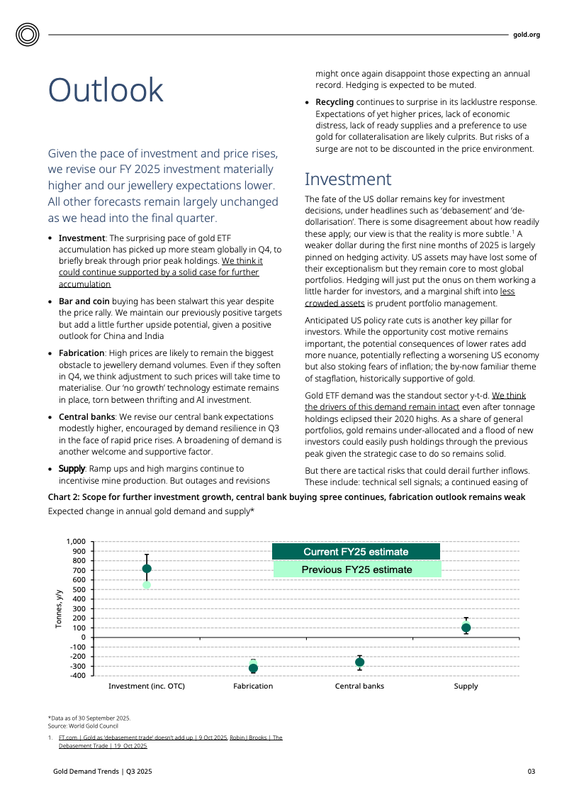 展望未来,黄金市场的结构性支撑依然坚实。全球货币政策转松、通胀黏性、地缘风险以及资产再配置趋势将继续推动投资需求。若价格维持高位,珠宝需求短期难以反弹,但在印度与中国市场的文化需求支撑下,长期修复可期。央行的战略性增储与投资者结构的转变,正使黄金重新成为全球资产配置的“核心锚”。从趋势上看,黄金正从传统避险资产转向“系统性价值储藏”,其金融化程度与战略地位正在进入新阶段。
