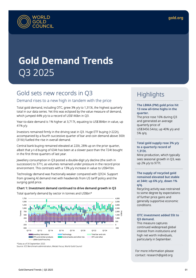 2025年第三季度,全球黄金市场再度改写纪录。世界黄金协会数据显示,总需求(含场外交易)同比上升3%至1313吨,为历史最高季度;按价值计,金市规模跃升44%至1460亿美元。年初至今累计需求3717吨,价值3840亿美元,同比增长41%。支撑金价节节攀升的主力来自投资端:黄金ETF持仓激增222吨,金条与金币需求连续第四个季度突破300吨。央行净购金220吨,环比增长28%。与此同时,金价创出13次历史新高,季度均价3456.54美元/盎司,同比飙升40%,推动黄金总供应量同样刷新纪录,达1313吨。