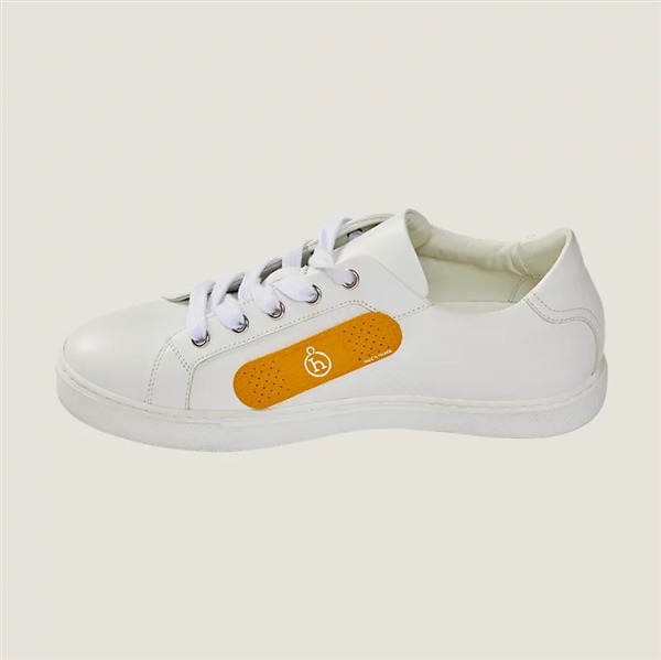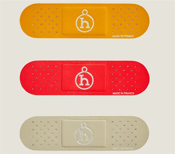 这款羊皮创可贴使用的是爱马仕制包剩余皮革边角料制造,因此颜色完全随机,采用可重复使用设计,两侧皮面设有穿孔,并涂覆粘合剂。