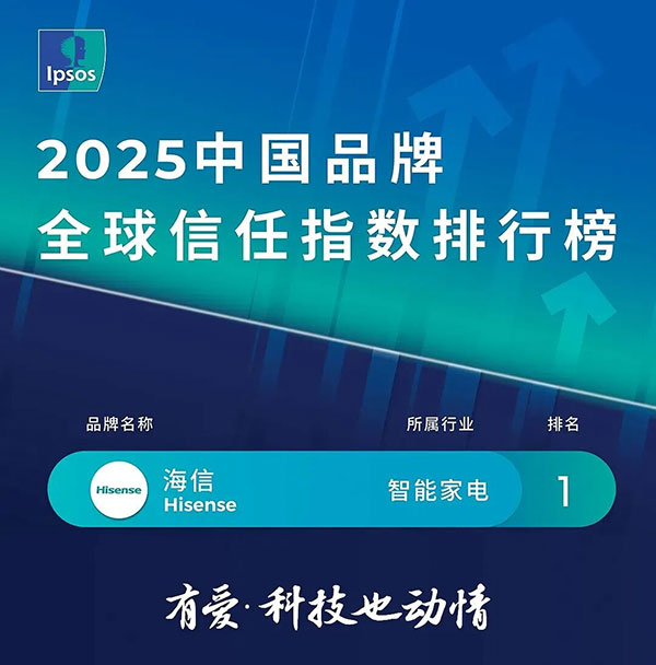 近日,全球知名市场研究机构益普索(Ipsos)发布了《2025 中国品牌全球信任指数》报告,报告显示,海信凭借在全球市场的优异表现,继2024年后再次蝉联智能家电行业第一。