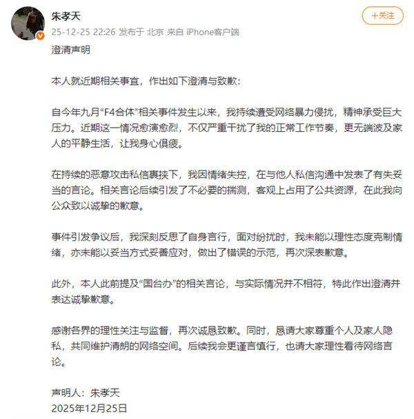 他提到,自今年九月“F4合体”相关事件发生以来,自己持续“遭受网络暴力侵扰,精神承受巨大压力”,而近期这一情况愈演愈烈,“不仅严重干扰了我的正常工作节奏,更无端波及家人的平静生活,让我身心俱疲。”