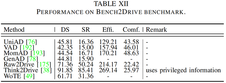 例如在 Bench2Drive 等闭环测评中,只有依赖专家信息的 Think2Drive 能够将综合驾驶得分提升至 92 分左右,而不使用专家信息的 Raw2Drive 得分仅为 71 分,多数使用世界模型方法的驾驶得分集中在 40-60 分之间,并伴随成功率与碰撞率的显著差异。