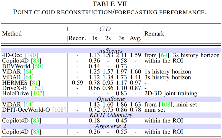 其次,当论文将分析重心转向点云与 Occupancy 表征相关实验结果时,出现了明显不同的趋势。基于三维或四维空间表征的世界模型,在多个实验设置中表现出更强的一致性和稳定性。
