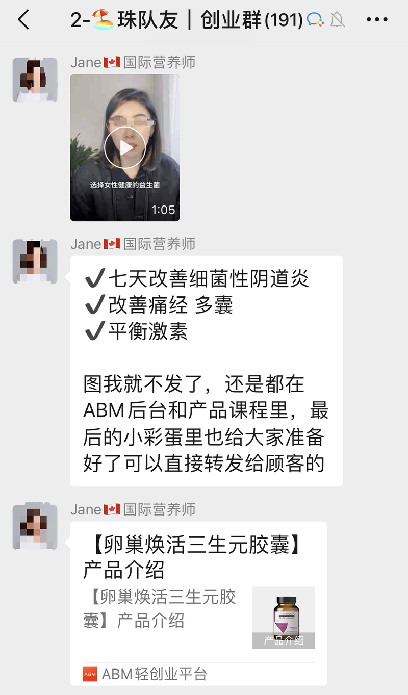 今年5月,一位名为“Jane国际营养师”的ABM经销商团队成员在经销商创业群分享产品推荐话术和资料。