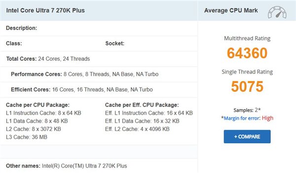 快科技12月26日消息,Intel下一代Arrow Lake Refresh系列处理器的消息不断流出,如今其中的酷睿Ultra 7 270K Plus出现在了PassMark中,其性能已与现款旗舰Ultra 9 285K平起平坐。