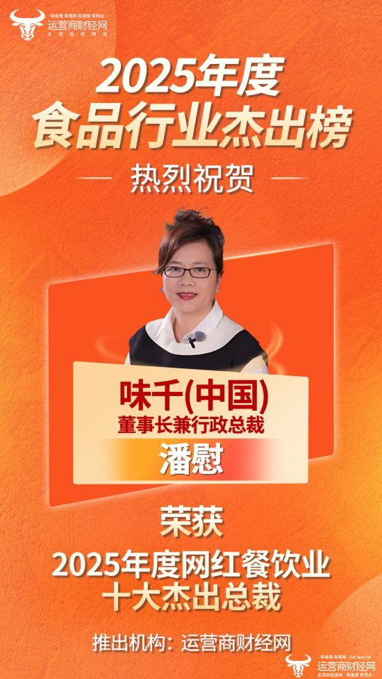 近日,由国内知名财经媒体运营商财经网独家打造的“2025年度网红餐饮业十大杰出总裁”正式公布,味千中国董事长兼行政总裁潘慰成功上榜!