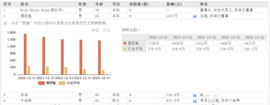 可以看出,穆彦魁一直深耕于粮油行业,积累了丰富的经验。而穆彦魁近五年薪酬分别为1750万元、1620万元、1512万元、1498万元及1472万元,薪酬呈逐年下降趋势,近五年累计降薪超270万元。尽管如此,穆彦魁去年薪酬仍为公司高管中的最高薪酬,也是公司高管中唯一薪酬超千万元的。