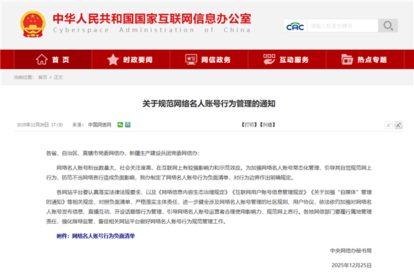 快科技12月26日消息,中央网信办今天发布了《关于规范网络名人账号行为管理的通知》。