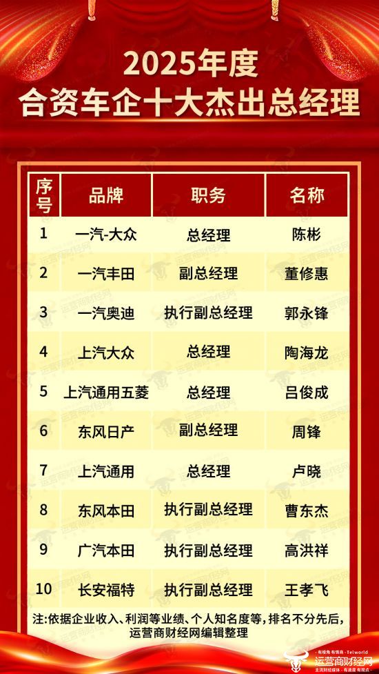 日前,运营商财经网重磅推出“2025年度合资车企十大杰出总经理”!上汽通用五菱总经理吕俊成入围。