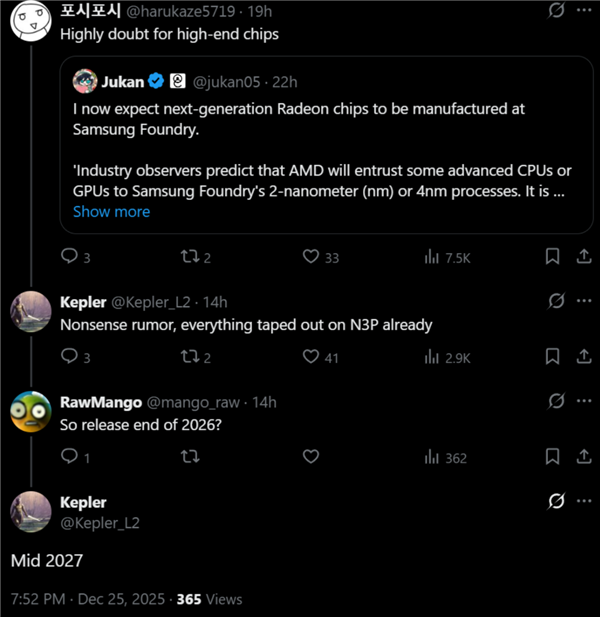 下一代显卡要等的更久了,日前AMD跟三星合作2nm工艺的消息引发关注,有人称下一代GPU也要用三星2nm或者4nm,不过爆料大户Kepler否认这一消息,表示已经准备用台积电N3P工艺流片。