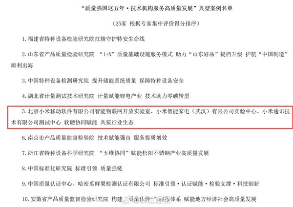 快科技12月26日消息,近日,小米武汉智能家电实验中心、智能物联网开放实验室、测试中心等三大国家CNAS认证实验室入选“质量强国这五年·技术机构服务高质量发展”全国典型案例。