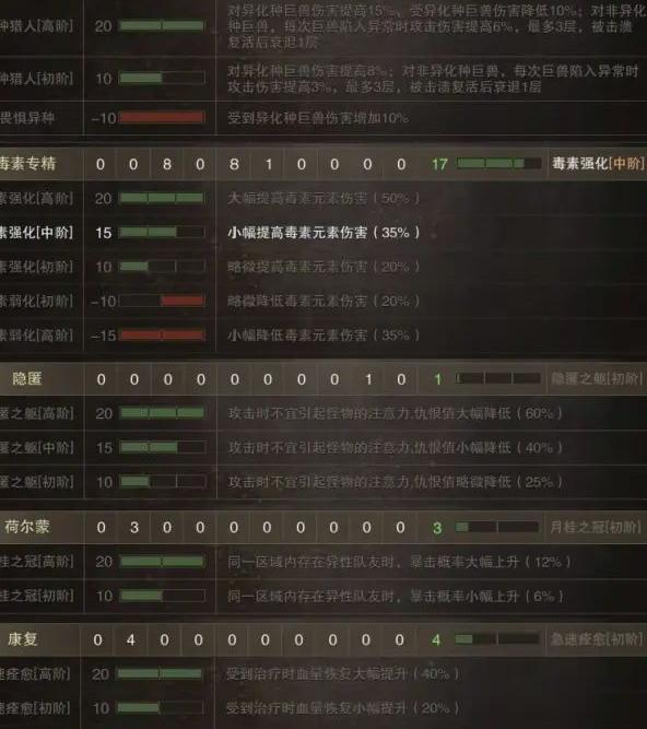 70级自带20点异化猎术、15点毒素专精、10点隐匿、7点荷尔蒙、3点诡诈以及-15点康复属性。只需额外通过坐骑、戒指以及镶嵌具备猎魂的方式补足5点毒素专精与3点荷尔蒙,即可完全激活冻尾蝎特技,获得20异化猎术、20毒素专精、10隐匿、10荷尔蒙和-15康复的完整加成。该套装对新人玩家极为友好。其中,隐匿提供的降低25%仇恨值效果显著提升了在队伍中的生存能力,而20点异化猎术不仅能减少自身承受的10%异化伤害,还能为对抗异化敌人带来15%的伤害加成;面对非异化目标时,每当巨兽进入异常状态,可叠加6%的伤害,最多三次,总计提升18%输出。值得注意的是,巨兽倒地也视为一次异常状态!因此即使没有使用异常触发类武器,只要战斗开始时利用麻痹陷阱触发一次异常,再配合控制型猎魂(如克苏鲁或阿撒托斯)实现倒地,便可轻松叠加两次,获得12%伤害增益(需注意:若巨兽在麻痹或眩晕状态下被击倒,则无法触发)。此外,荷尔蒙带来的暴击加成仅需队伍中存在异性成员即可激活,条件宽松;尽管负康复会削弱20%治疗效果,但整体影响有限。20点毒素专精更可直接提供50%的伤害加成,输出增幅极为可观。整套机制兼顾生存与爆发,实用性极强。