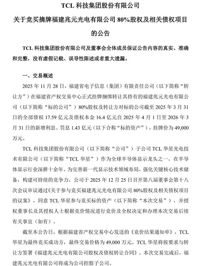 12月26日晚间,TCL科技的一纸公告引发行业震动——其子公司TCL华星光电以4.9亿元成功竞得福建兆元光电80%股权及相关债权。这场看似普通的资本运作背后,隐藏着中国半导体显示产业格局重构的重要信号。通过梳理交易细节与产业脉络,一个关于产业链垂直整合、技术突围与供应链自主可控的战略蓝图正逐渐清晰。