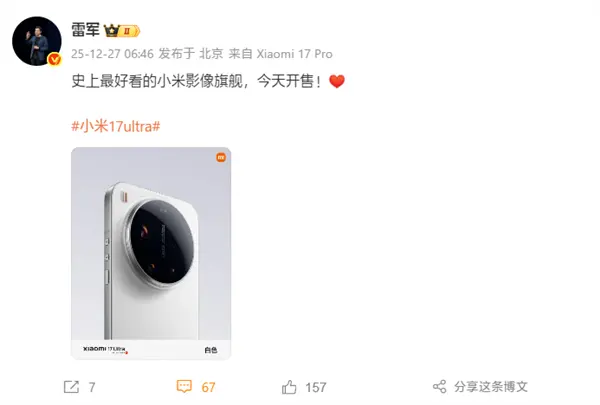 12月27日消息,今天早上不到7点,小米创办人,董事长兼CEO雷军就发文表示:“史上最好看的小米影像旗舰,今天开售”。