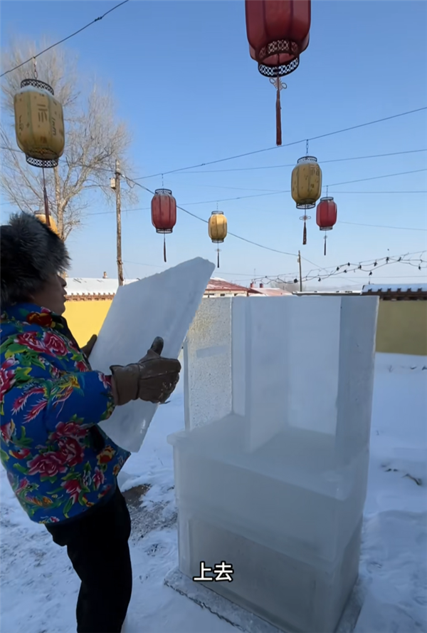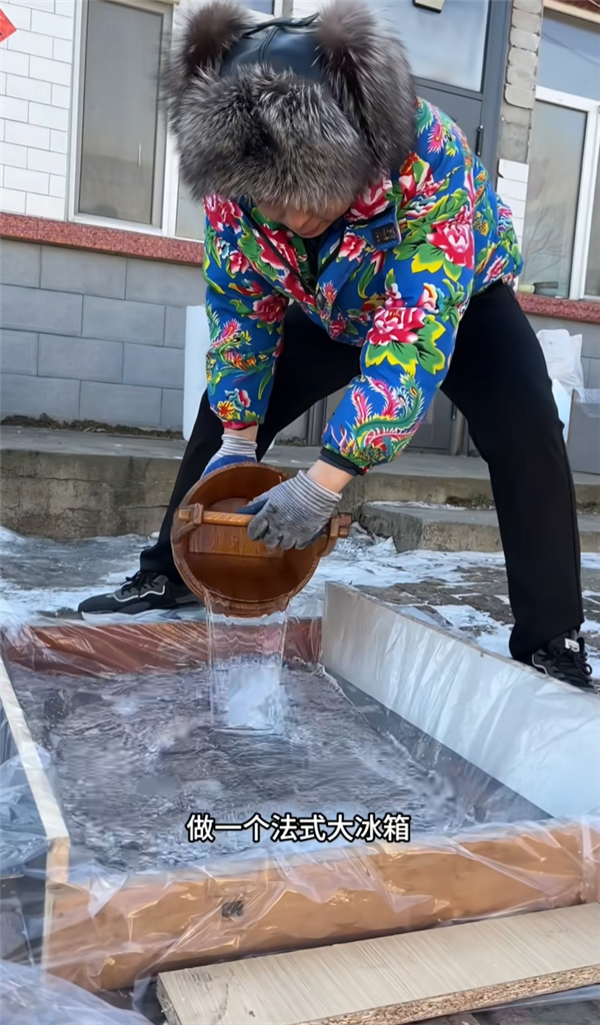 制作并不复杂,用木板搭建一个水槽,铺上塑料布,倒上水,一块完整的冰块就诞生了。