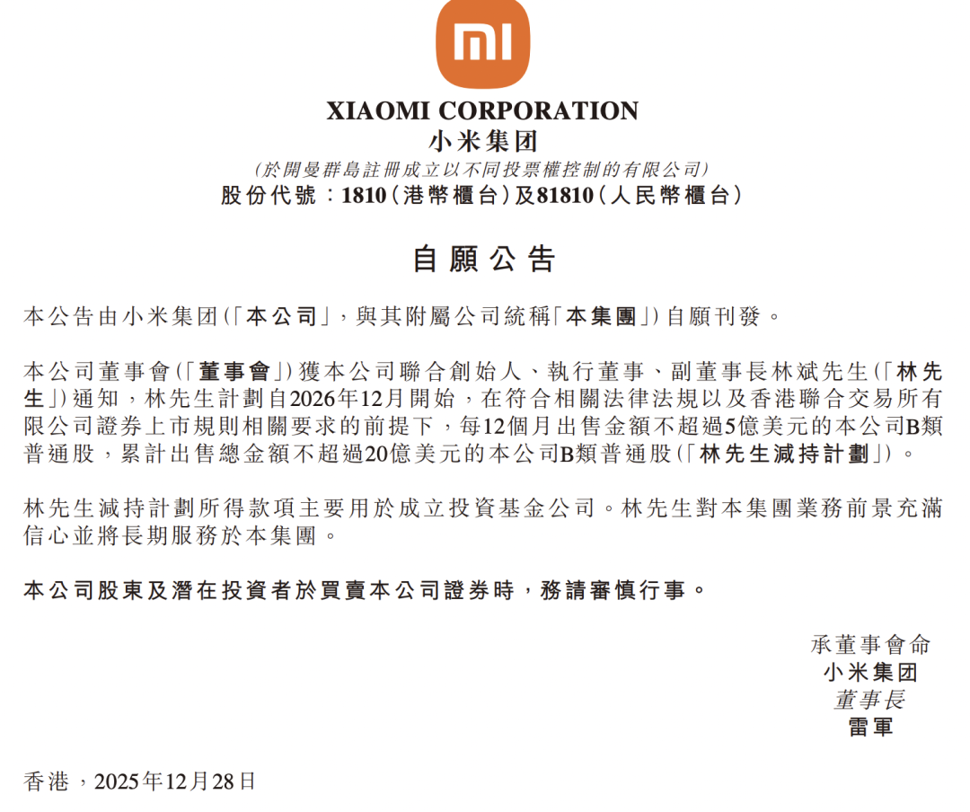 C114讯 12月29日消息(云青)12月28日,小米集团发布公告称,公司联合创始人、执行董事、副董事长林斌计划自2026年12月起,在符合相关法律法规及香港联交所上市规则要求的前提下,每12个月出售金额不超过5亿美元的公司B类普通股,累计减持总金额不超过20亿美元。