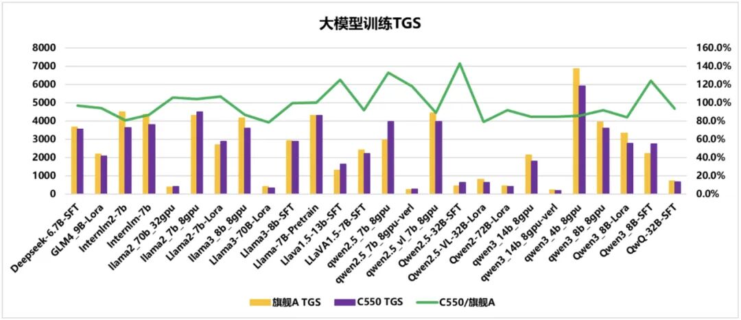 DeepSeek、GLM、InternLM、Llama、Qwen 等多系列大模型,在不同参数规模(如 7B、13B)及任务类型(SFT、Pretrain)下的训练 TGS 数据,包含「旗舰 A TGS」(黄色柱)、「C550 TGS」(紫色柱)及两者效率比值(绿色折线)。