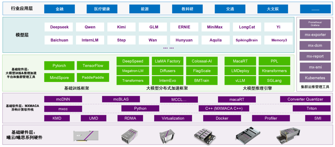 MACA 不仅是一个技术平台,更是沐曦「1+6+X」战略的重要组成部分。在这一战略中,「1」代表数字算力底座,「6」代表对于六大核心行业的赋能,包括金融、医疗健康、能源、教科研、交通和大文娱等行业的 AI 场景应用及开源生态建设,「X」代表具身智能、低空经济等新兴行业。