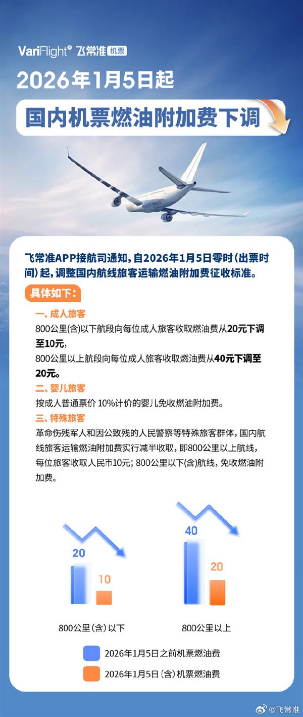 快科技12月29日消息,今日,据“飞常准”消息发布,机票销售平台飞常准APP接航司通知,自2026年1月5日零时起,下调国内航线旅客运输燃油附加费征收标准。具体如下: