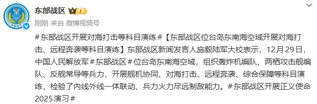新京报讯 据东部战区官博消息,东部战区新闻发言人施毅陆军大校表示,12月29日,中国人民解放军东部战区位台岛东南海空域,组织轰炸机编队、两栖攻击舰编队、反舰常导等兵力,开展舰机协同、对海打击、远程奔袭、综合保障等科目演练,检验了内线外线一体联动、兵力火力尽远制敌能力。