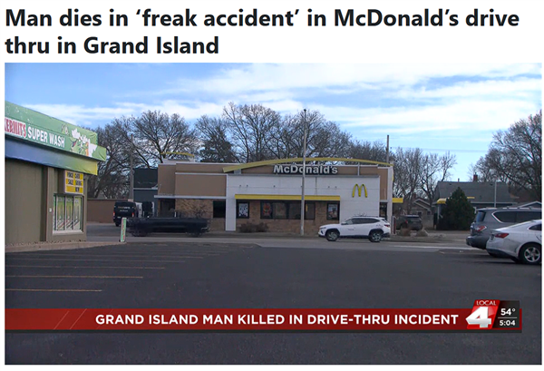 当时69岁男子迈克尔・迪金森在驾车付款时,自己的车辆突然开动,导致他被车门与餐厅窗口台面夹压,经抢救无效身亡,一名施救的麦当劳员工也在过程中受伤。